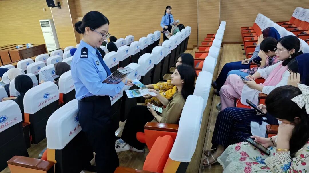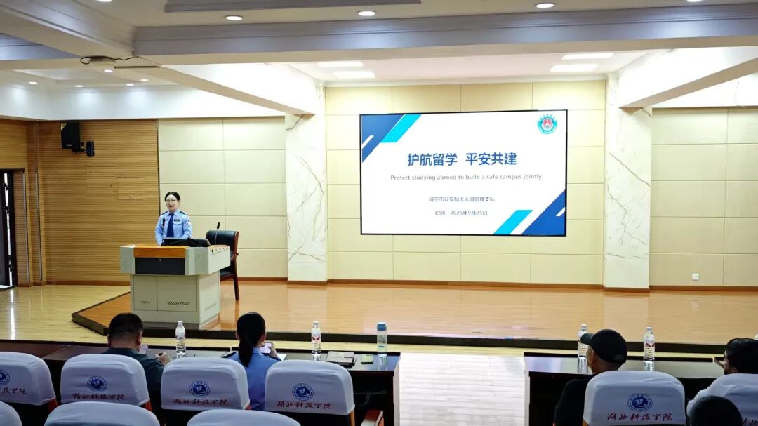 2025年9月25日下午,湖北科技学院国际教育学院的教室里,暖光映着一张张年轻的异国面庞。咸宁市公安局出入境管理支队的民警们受邀走进校园,为来自巴基斯坦、印度尼西亚、坦桑尼亚等国家的233名外籍留学生带来了一堂以“护航留学 平安共建”为主题的普法宣讲课,用法治架起了一座跨文化交流的桥梁。