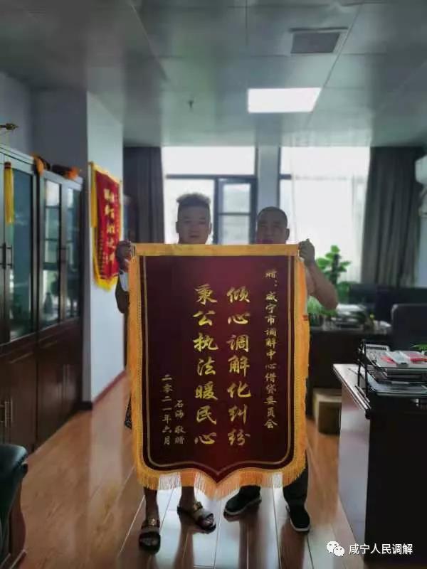 6月15日上午,申请调解当事人石某向咸宁市人民调解中心借贷专调委送来一面上书“倾心调解化纠纷秉公执法暖民心”的锦旗致谢,用他的话说:“我的纠纷虽然从‘退一赔十’止于‘退一赔五’,但我获得了公平正义,很开心!”