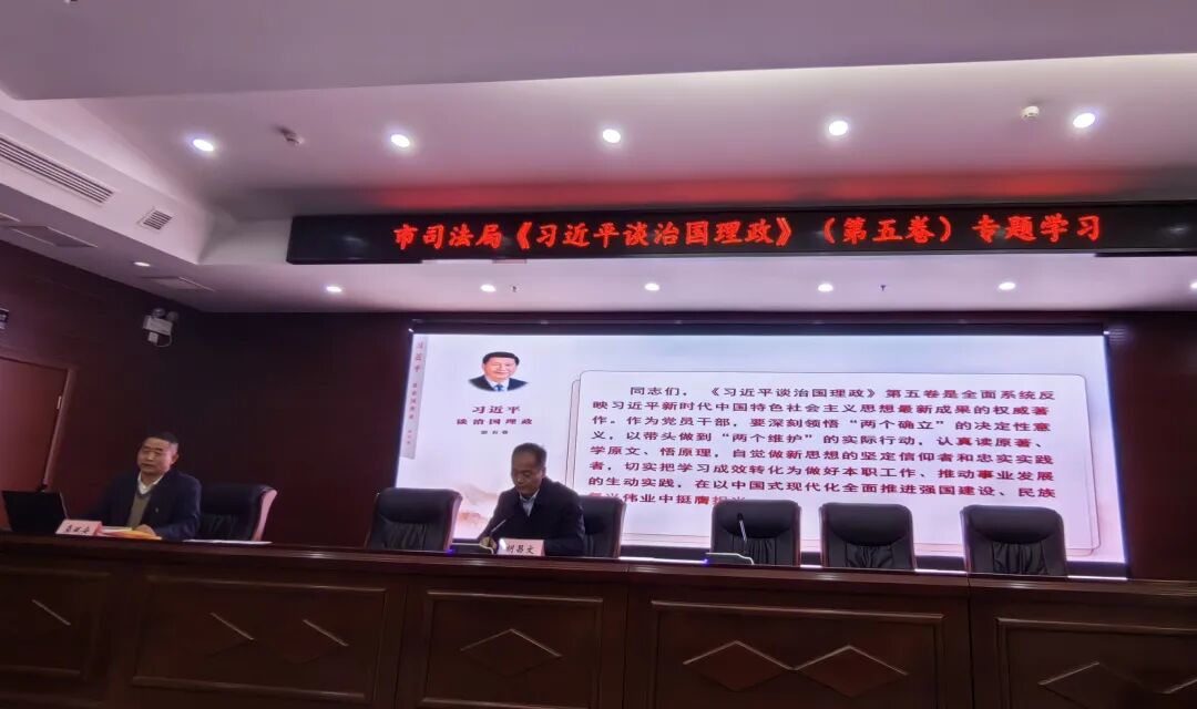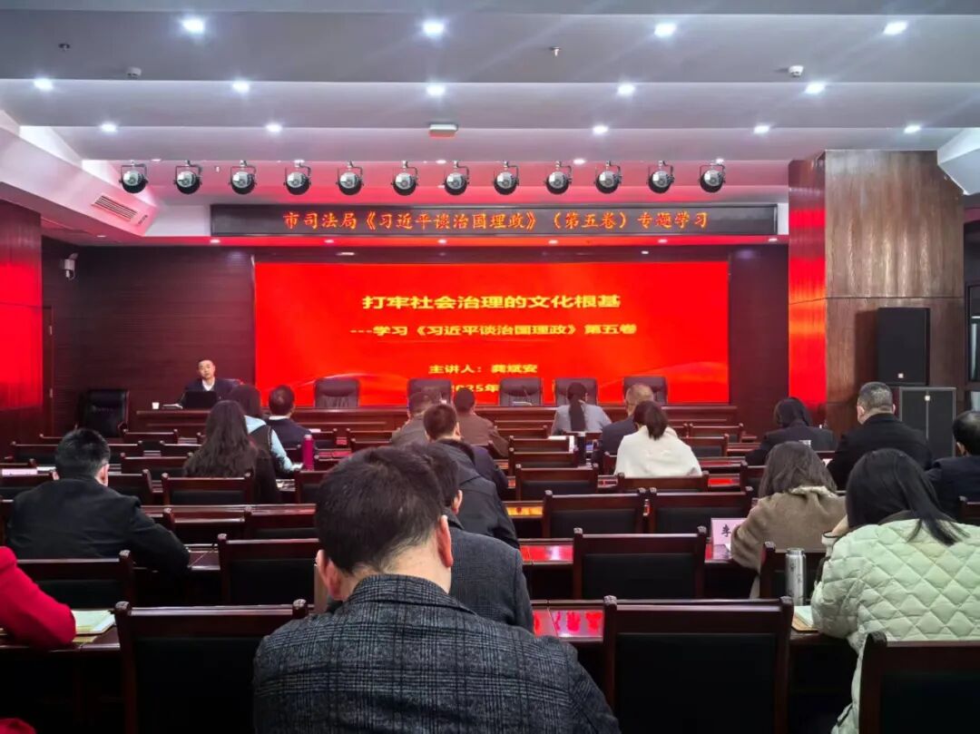 胡昌文在主持讲话中指出,党的二十届四中全会,是在即将进入基本实现社会主义现代化夯实基础、全面发力关键时期召开的一次十分重要的会议,是乘势而上、接续推进中国式现代化建设的又一次总动员、总部署。学习好、宣传好、贯彻好全会精神,是当前和今后一个时期全党全国的重大政治任务。《习近平谈治国理政》第五卷是新时代中国共产党人坚持和发展中国特色社会主义的最新理论结晶。学习宣传贯彻好这一重要著作,也是当前和今后的一项重要政治任务。要以此次宣讲为契机,坚持学思用贯通、知信行合一,对标对表习近平总书记对“十五五”规划编制工作的重要指示要求和党的二十届四中全会精神关于推进社会主义民主法治建设的安排部署,抓住“十五五”承前启后的关键窗口期,完成“十四五”圆满收官与“十五五”前瞻布局,认真研究编制“十五五”时期法治咸宁建设规划。要提高政治站位,推动学习“入脑入心”、走深走实。通过开展业务研讨、心得体会交流等方式,将对党的创新理论的理解,融入全面依法治市的生动实践,转化为深化法治政府建设、优化公共法律服务、提升行政执法质量、筑牢社会稳定防线的具体行动,为打造武汉都市圈绿色发展重要增长极提供坚实的法治保障。
