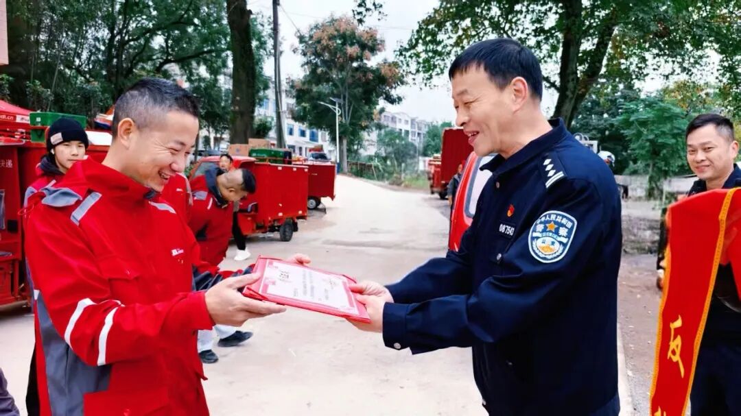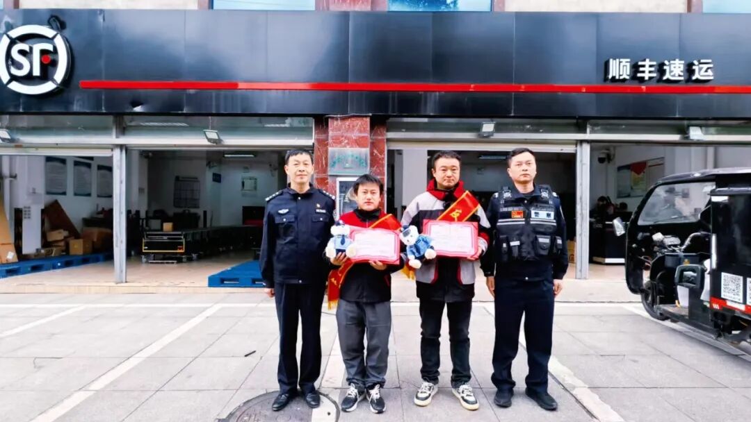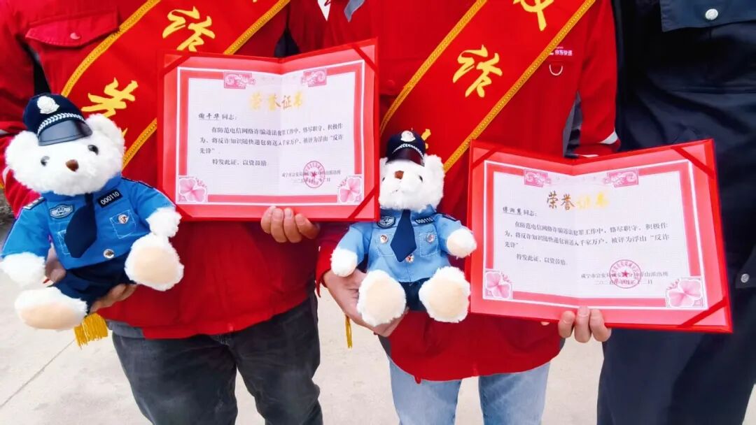 咸安公安浮山派出所所长钱兵带领民警亲自上门,为4名在反诈宣传中表现突出的快递小哥颁发“反诈先锋”荣誉证书和定制的“警察小熊”,向这些穿梭于城市脉络、守护着千家万户“钱袋子”的无名英雄致敬。